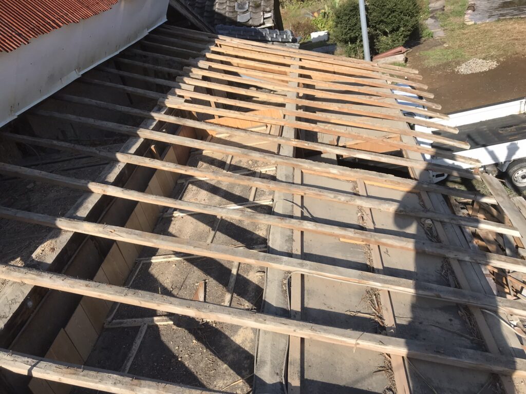 一次防水の屋根材(写真は瓦)を撤去した状態です